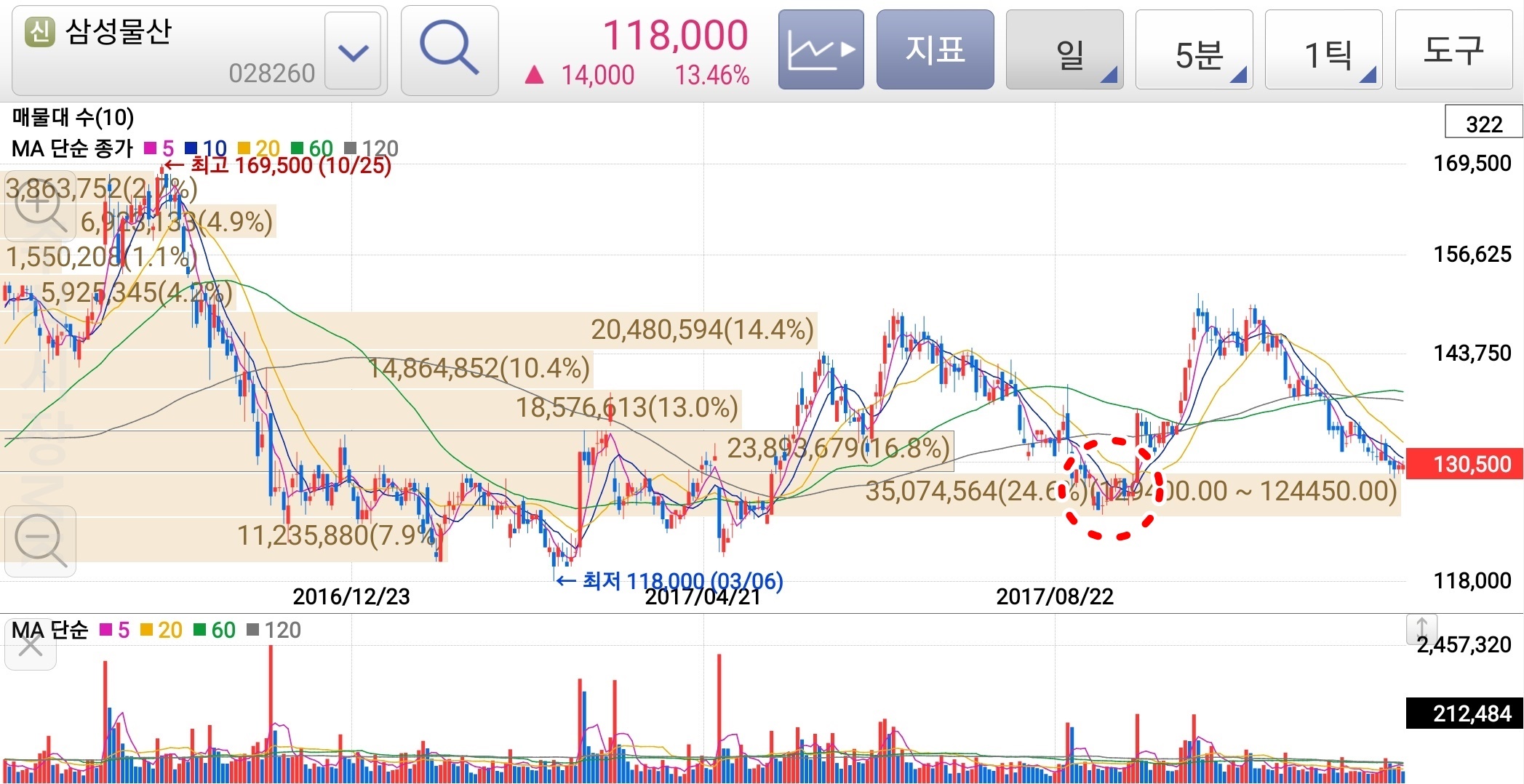 매물대 차트 보는법 첫번째 본전심리가 적용되는 저항 구간을 분석해볼 수 있습니다. 많은 거래가 동반된 구간을 살펴보면 위 차트상에서는 17,615,953주, 전체 거래량의 29.9%, 132,500 ~ 129,450 저항 가격대가 됩니다. 즉, 많은 사람들이 대량 거래로 본전 매도를 희망하는 투자자들이 많이 밀집된 구간이라는 의미입니다. 주가는 계속 상승을 하지만 저항 구간을 돌파하지 못하고 다시 하락하는 모습을 확인할 수 있습니다.