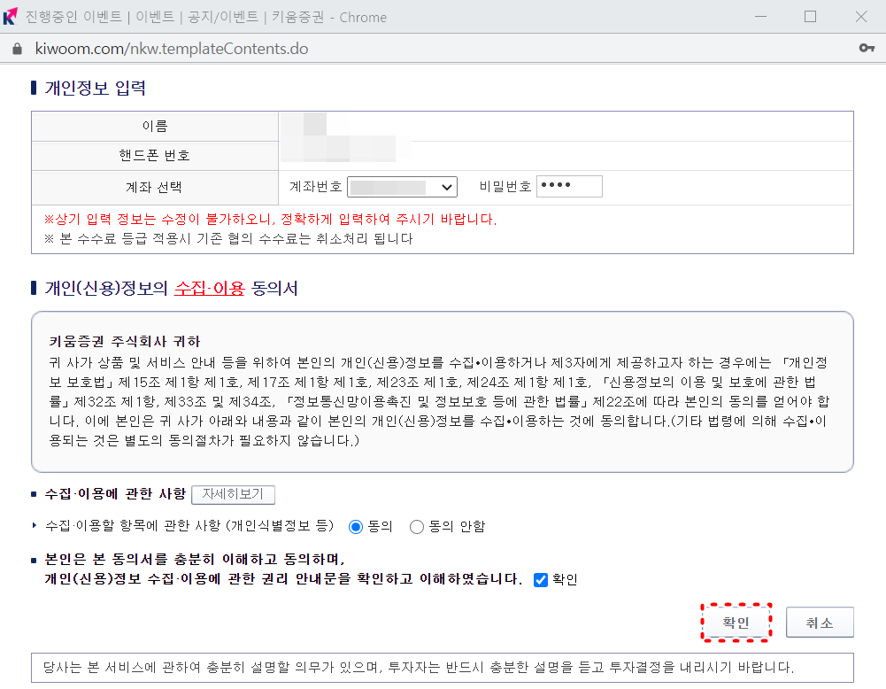 3. 계좌 비밀번호 입력 뒤 개인정보 동의를 하신 뒤 확인을 누릅니다.