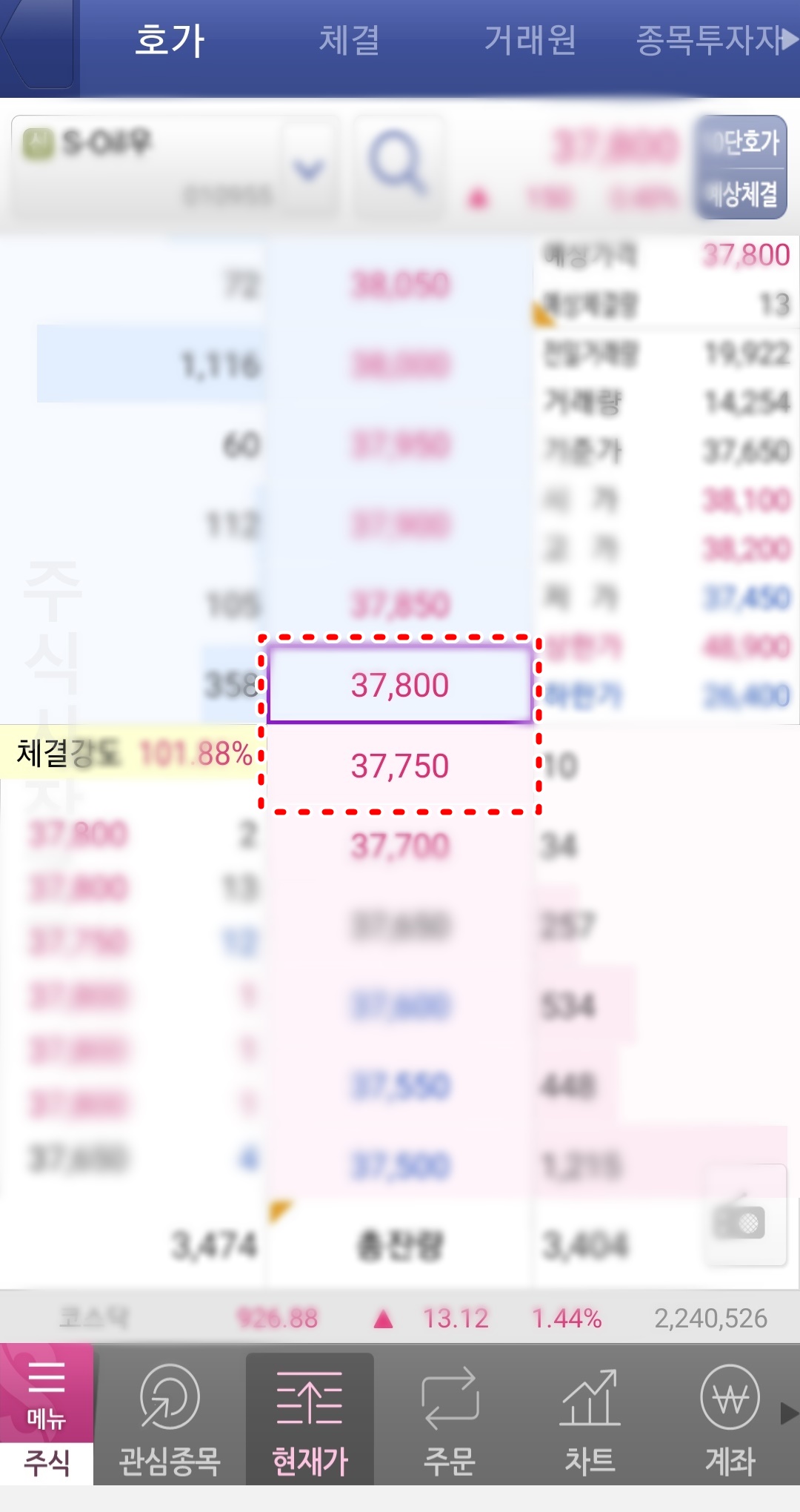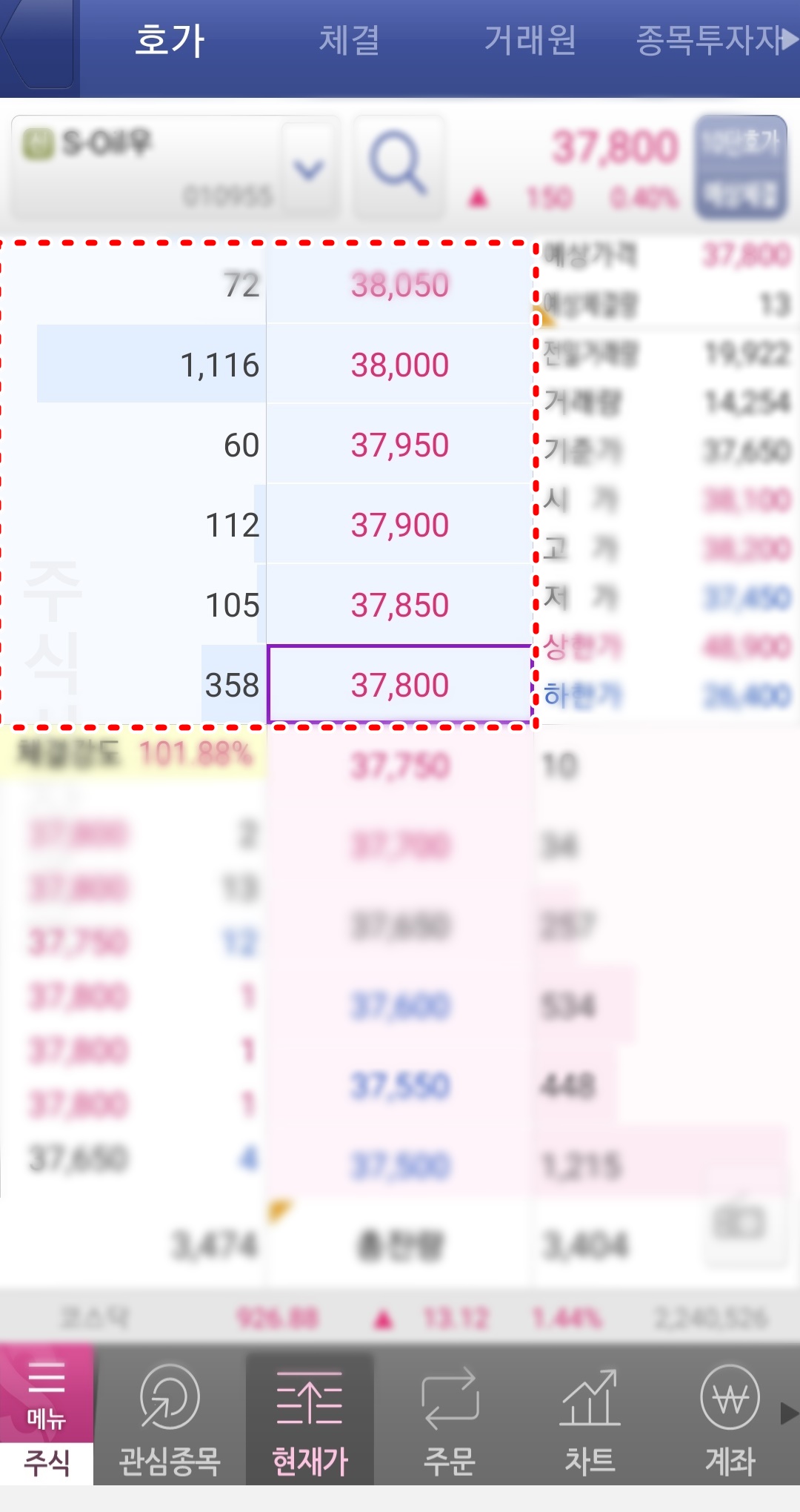 ◎ 사진상 중앙에 있는 빨간색 표시 부분인 매도와 매수는 현재 형성된 가격을 의미합니다.
