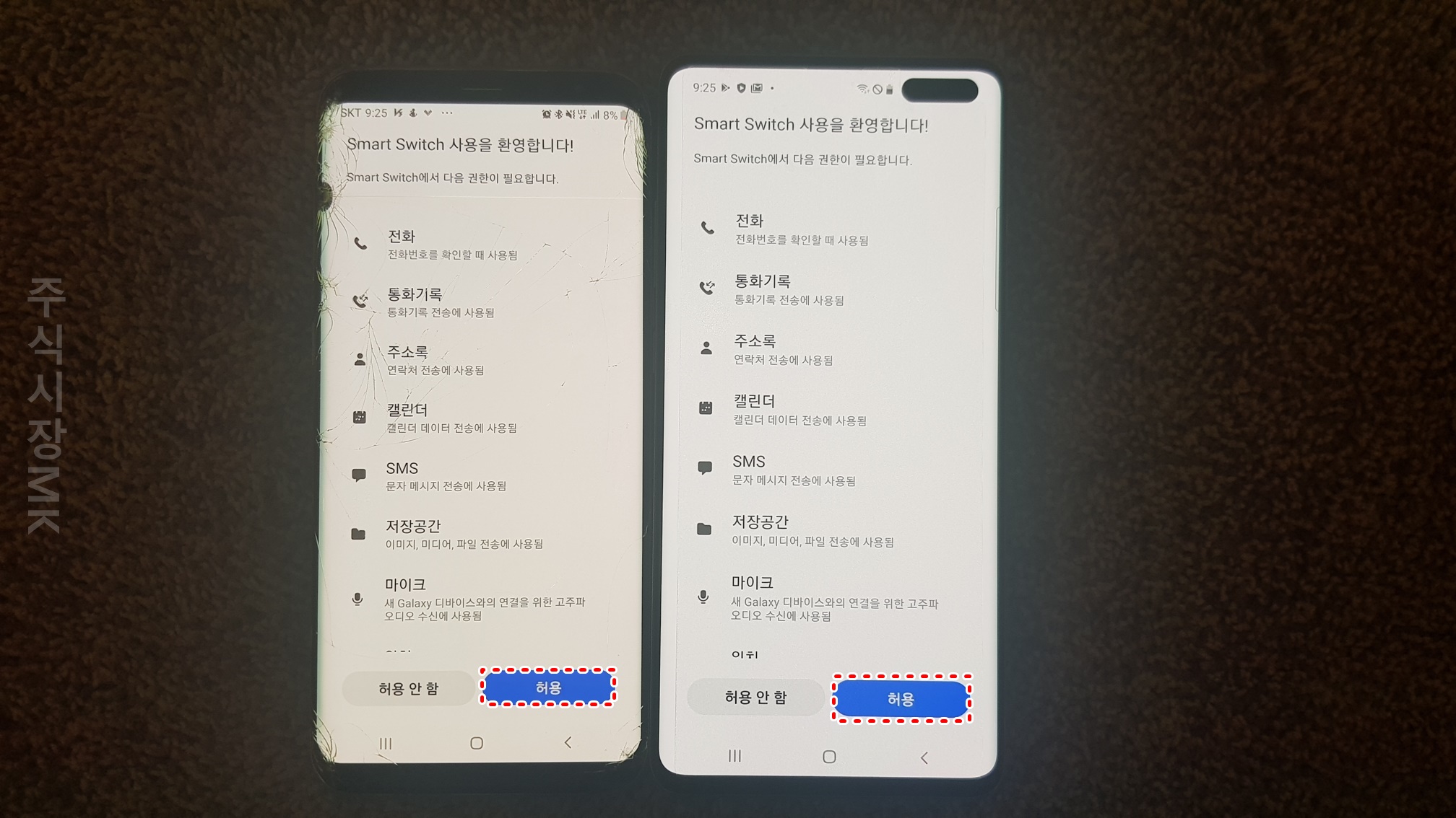 왼쪽이 구 스마트폰, 우측이 새롭게 구매한 갤럭시 스마트폰입니다. 두 스마트폰 모두 전원을 켜주시고 모바일 데이터나 와이파이에 연결하셔야 합니다. 새 스마트폰의 경우 유심을 옮기기 전이기 때문에 모바일 데이터 이용이 불가능합니다. 그러니 반드시 와이파이를 활성화하시거나, 이전 사용 스마트폰에서 모바일 핫스팟을 켠 뒤 인터넷을 연결해주셔야 합니다.
