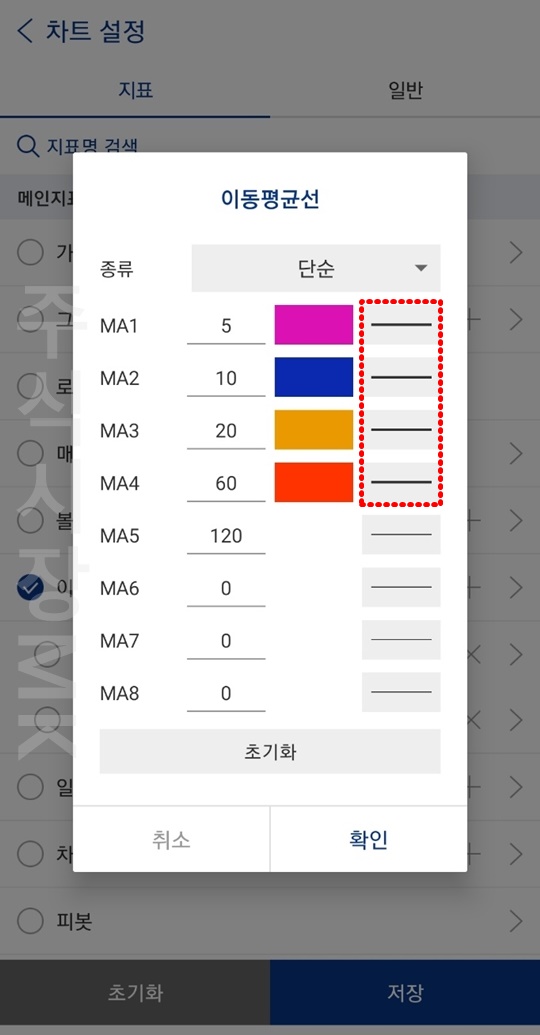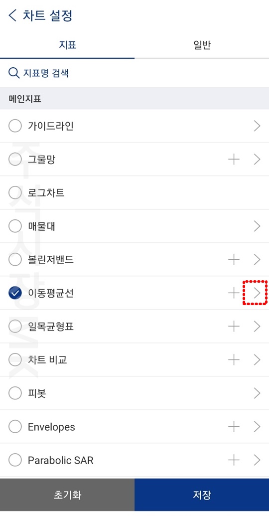2. 이동평균선 우측 >를 누릅니다.