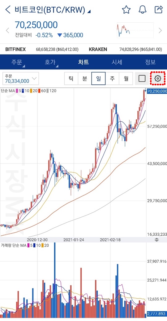 1. 업비트 차트에서 우측 상단 설정 메뉴를 클릭합니다.