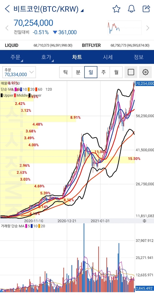 비트코인의 가격이 연일 상승하면서 안전자산인 금을 대체하였다는 관점이 지지를 받고 있습니다. 그만큼 디지털자산이 인정받게 되었고 분산차원에서 반드시 트레이딩해야 하는 투자 자산이 되었습니다. 그래서 저도 차트 투자를 주로 하는 입장에서 올해부터 코인 트레이딩을 시작하였는데 주식과 달리 차트의 지표의 따른 지지, 저항이 놀라울정도로 쉽게 잘맞아들어가 높은 수익을 내고 있습니다. 주식과 달리 코인은 적절한 가치평가로 가격 산정이 불가능하여 가치투자자들은 코인 투자를 해서는 안된다는 관점이 많지만, 반대로 저와 같은 차트투자자들의 경우 가치평가가 이루어질 수 없다는 것은 내재적 가치로 인한 하락 가능성이 존재하지 않아 투자 위험이 감소한다는 말과 동일합니다. 예를 들어 주식에서 차트투자의 관점상 지지 가격에 매수하여 수익을 내려고 하였는데 판단하기 어려운 투자 회사의 재무적 실적악화 등의 이유로 쉽게 지지라인 이하로 하락하여 손실을 보는 경우가 많아 손절이 중요하지만 코인에서는 그런 위험성이 0에 수렴하기 때문입니다.