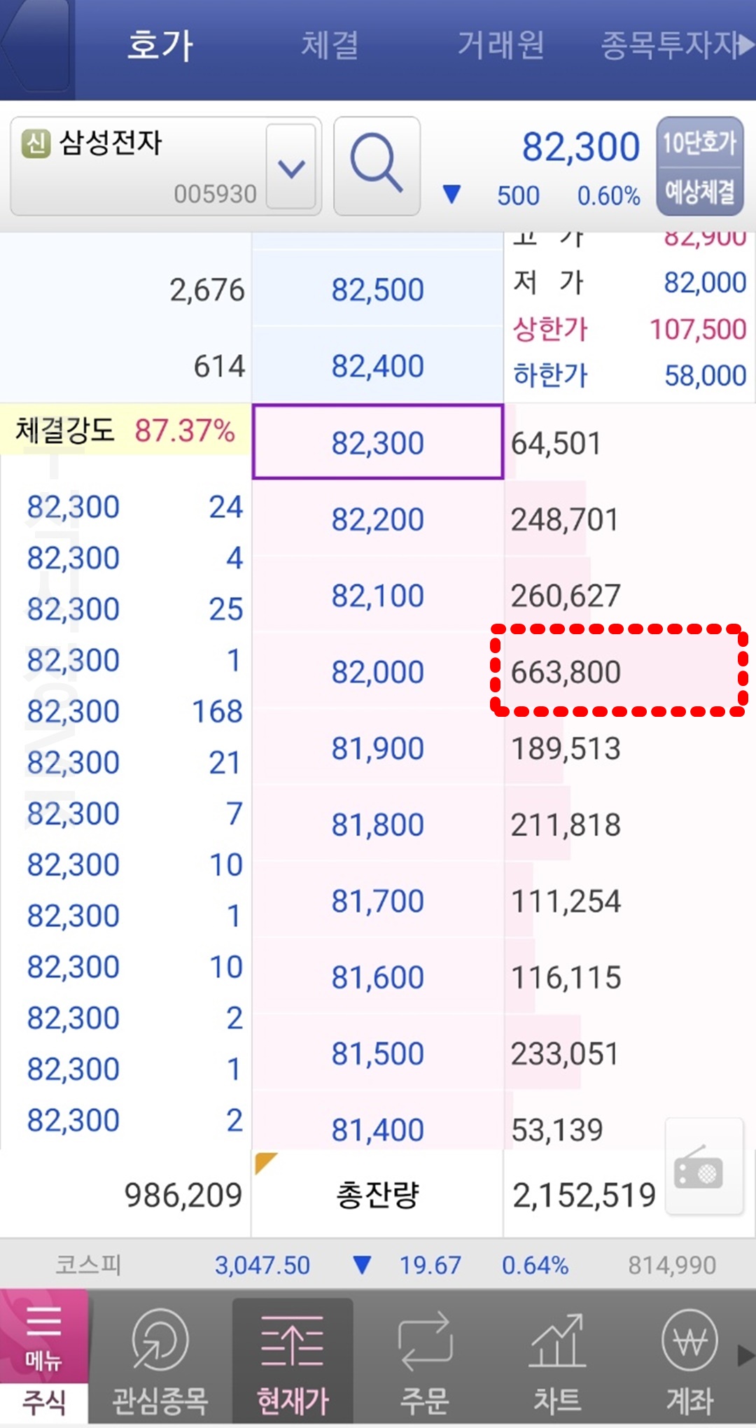 주식에는 시간 우선의 법칙이 있습니다. 쉽게 해석하면 동일한 가격에 주문을 낸 사람들이 많다면 먼저 주문을 신청하여 걸어둔 사람의 주문부터 체결시켜준다는 것입니다. 그래서 예를 들어 위 호가창을 보면 삼성전자의 주가 82,000원에 매수 주문이 663,800주가 미리 걸려 있는 것을 볼 수 있는데 내가 만약 82,000원에 100주의 매수 주문을 신청했다고 한다면 삼성전자의 가격이 하락하여 82,000원이 되어 거래가 되더라도 나보다 앞전에 신청한 663,800주가 모두 거래가 되야만 내가 주문한 100주가 체결될 수 있는 것입니다.