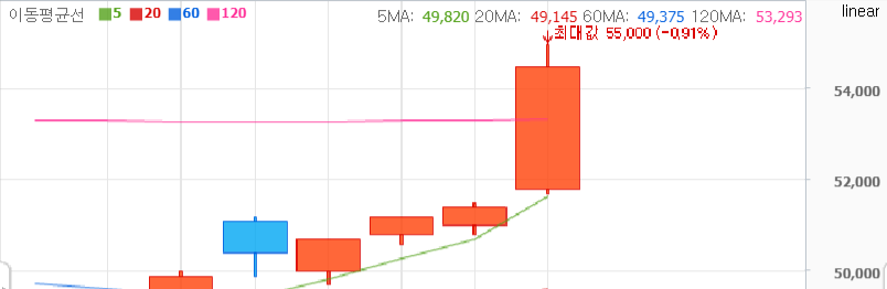 4. 몸통위 윗쪽은 종가인 54,500원이 그려지고 꼬리의 윗쪽은 고가인 55,000원이 그려집니다.