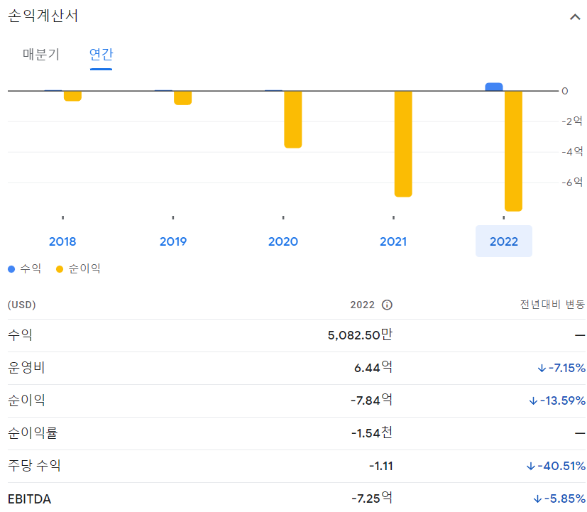 니콜라의 손익계산서를 살펴보면, 비교적 최근까지 매출액은 0달러이며 영업이익과 순이익 모두 마이너스 값을 기록했습니다. 이는 니콜라가 아직 상용화된 제품을 출시하지 않았기 때문입니다. (즉 매출 이익은 없고 투자로 인한 지출만 존재하고 있음)