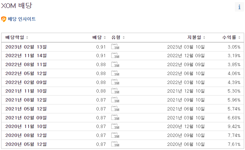 엑슨모빌의 배당금 측면에서는 지속적으로 배당을 지급하고 있습니다. 현재 엑슨모빌은 0.91 달러의 배당금을 지급해주고 있고 시가배당률로는 약 3.34%입니다. 참고로 엑슨모빌의 배당지급일은 2,5,8,11월입니다.