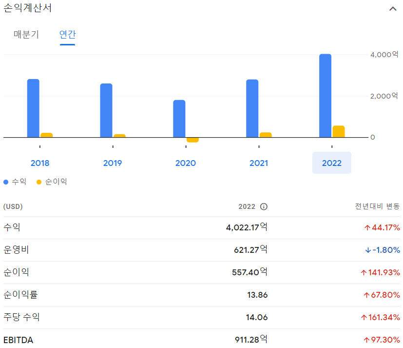 2020년, 석유가격의 급감 및 코로나로 인한 수요 제한으로 인하여 엑슨모빌은 적자를 달성하였습니다. 하지만 이 후 엔데믹 및 인플레이션 시대가 도래하며 이익이 빠르게 급증하는 모양세입니다. 그래서 코로나 이전 2018년대비 2022, 2023년의 매출과 수익이 훨씬 높아지게 되었습니다.