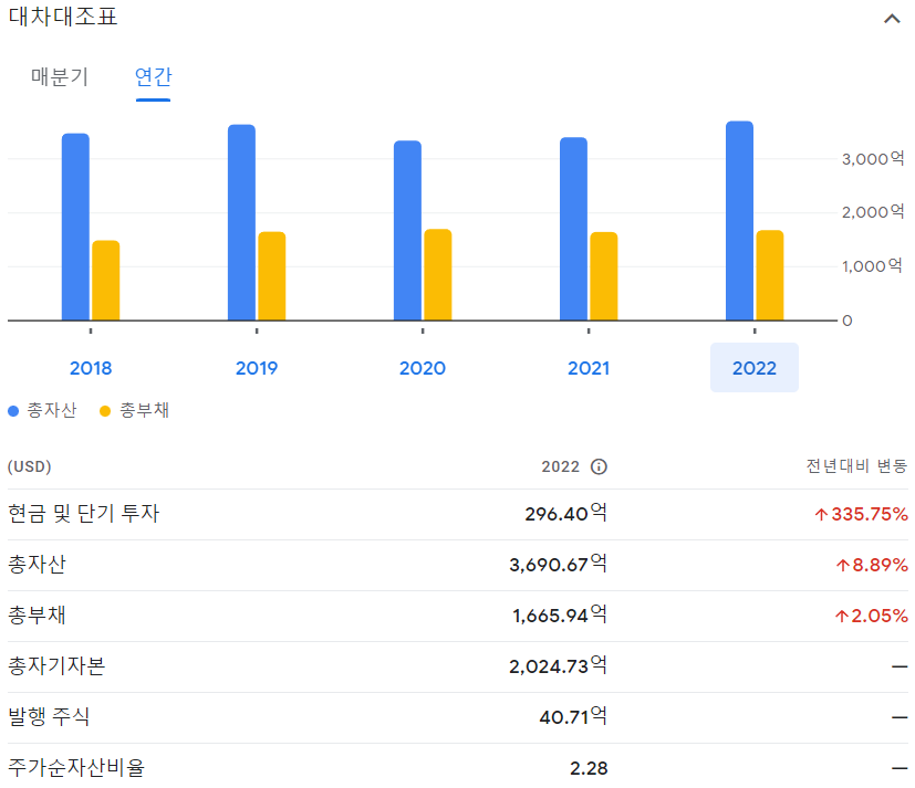 대차대조표를 통해 확인할 수 있는 것은 엑슨모빌의 안정적인 재무상태입니다. 부채비율이 굉장히 낮은데, 이는 기업의 안정성을 평가하는 중요한 지표 중 하나입니다. 이러한 안정성은 향후 업계 경쟁력을 유지하기 위한 자금을 확보하는 데 있어서 중요한 역할을 할 것으로 보입니다.