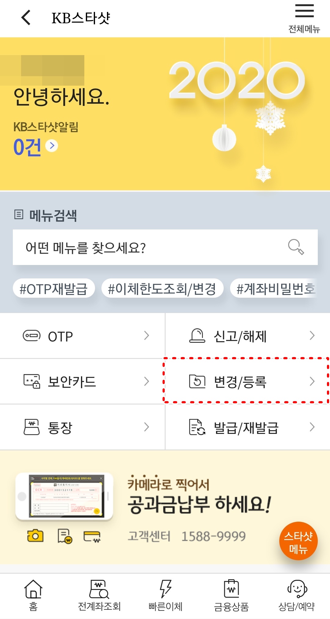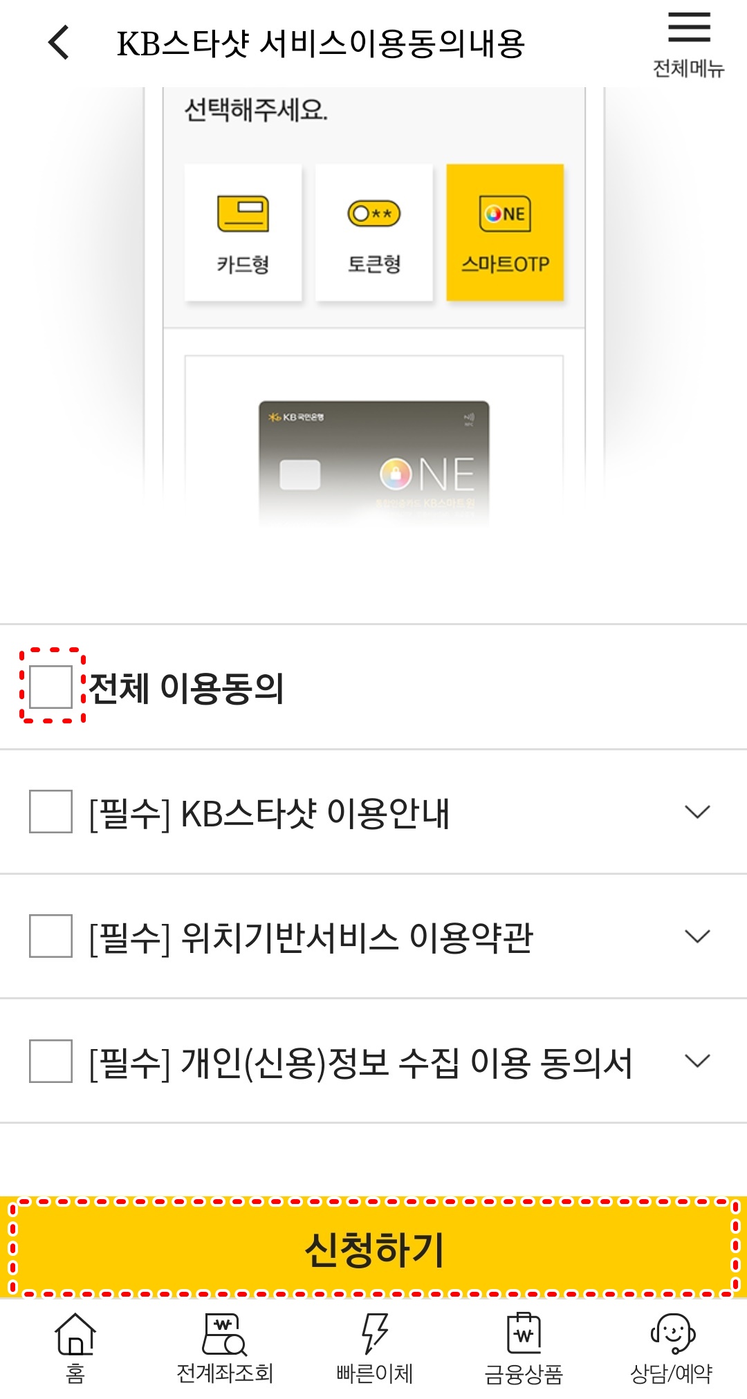 5. KB스타샷을 한번도 이용하지 않았다면 전체 이용동의를 해주시고 신청하기를 한 뒤 다시 변경/신고/재발급을 이용해주시면 됩니다.