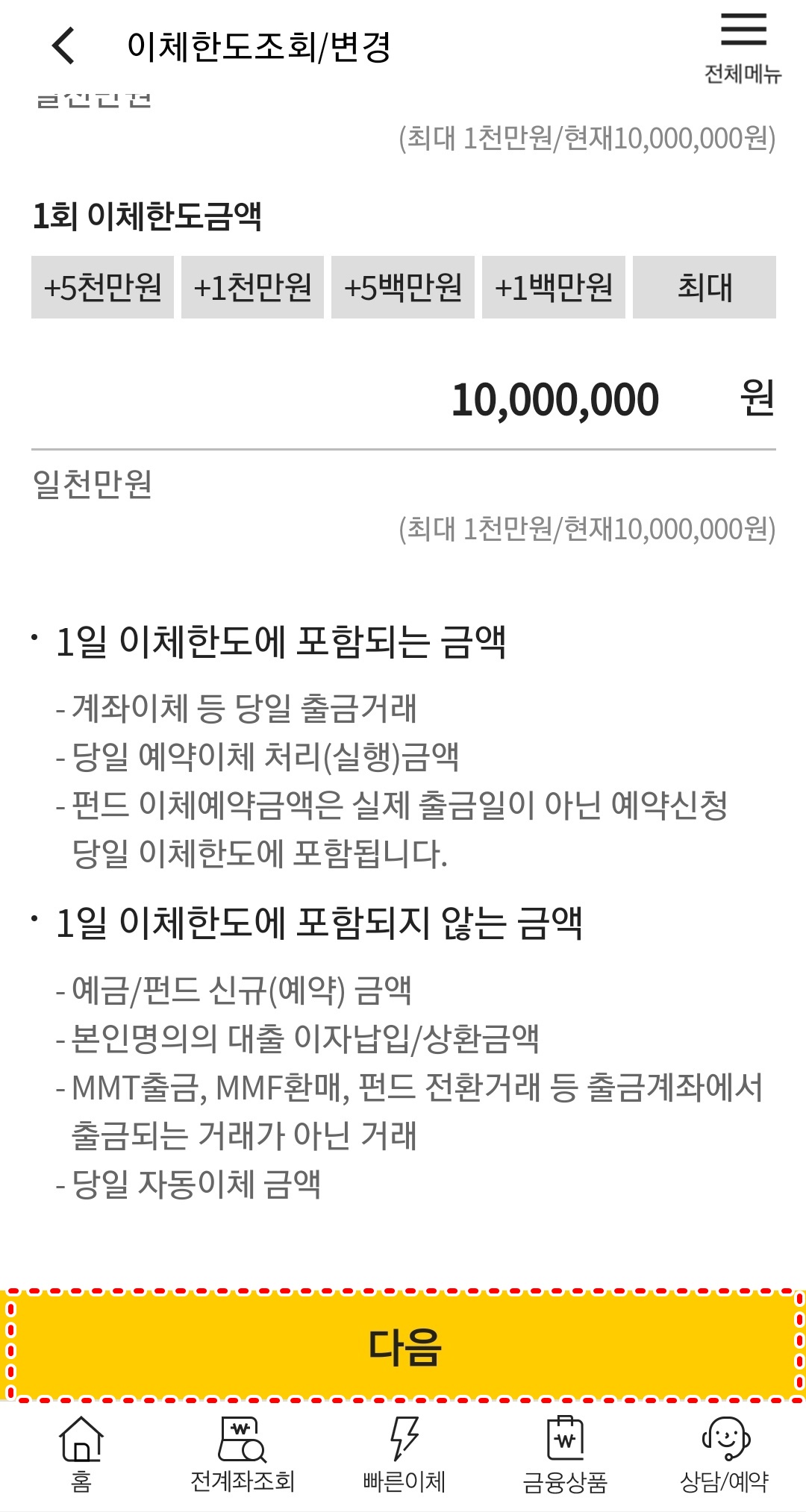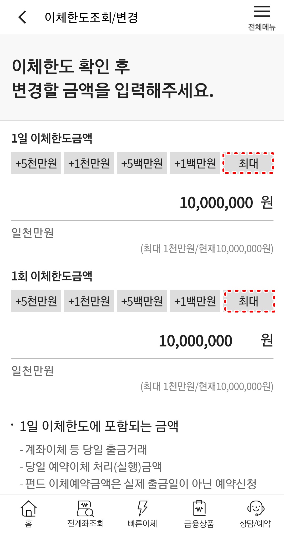 9. 1일 이체한도 금액과 1회 이체한도 금액을 모두 최대로 설정합니다.