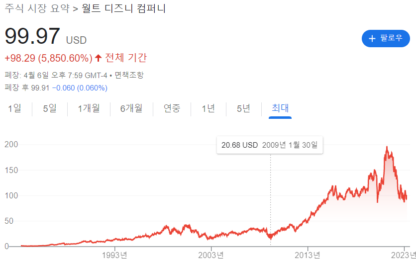월트 디즈니(DIS)의 주가는 오랜기간 상승해왔지만 최근 큰 주가폭락 조정이 일어났습니다. 미디어의 전반적인 사업의 성장성이 둔화되고, 고금리 상황에 이어서 디즈니 직원들의 구조조정 등과 함께 주가에 큰 영향을 주었기 때문입니다.