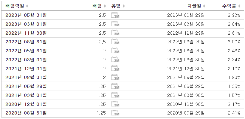 골드만삭스는 배당금 수익률도 높아 투자자들에게 인기가 있는 종목인데요. 현재 골드만삭스는 분기배당을 실시하고 있으며 배당수익률은 약 2.95%, 배당지급일은 3,6,9,12월입니다.