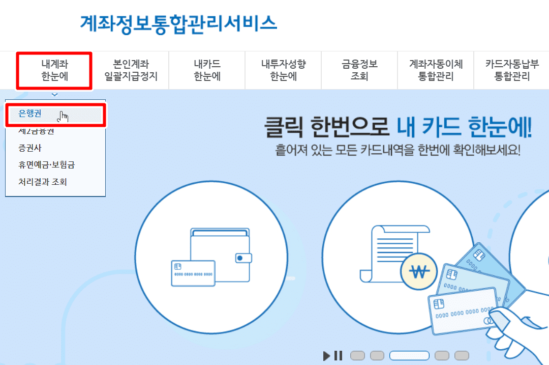 2. 상단에서 내계좌 한눈에 > 은행권을 클릭합니다.