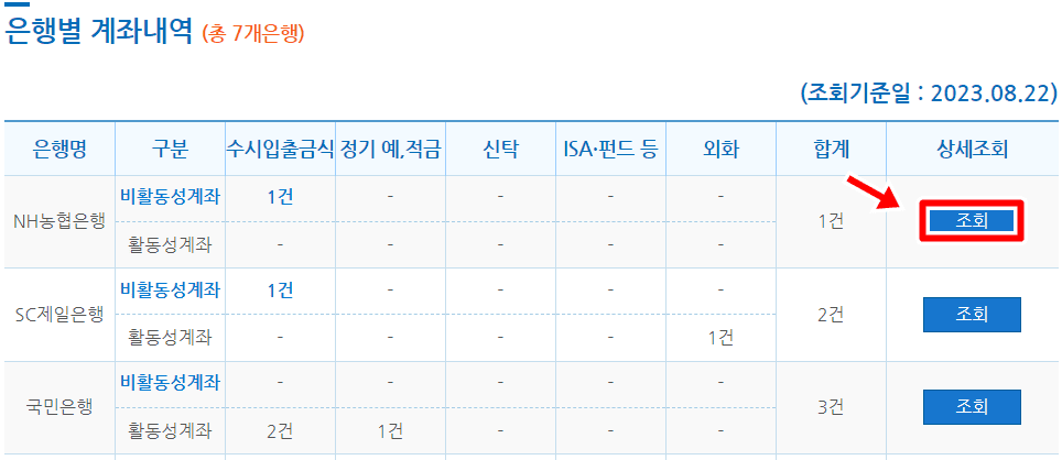 13. 상세한 계좌 정보를 보고 싶은 은행의 조회 버튼을 클릭합니다.