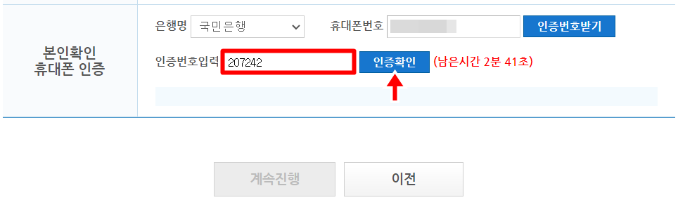 10. 수신된 문자 인증번호를 입력하고 인증확인을 누릅니다.