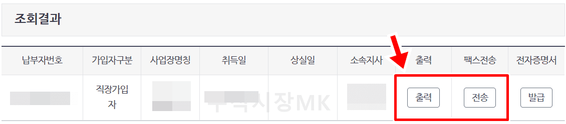 출력은 건강보험료 납부확인서를 PDF 저장 및 프린터 출력을 할 수 있는 기능입니다. 만약 바로 팩스로 발급하고 싶으시다면 팩스전송 아래의 전송을 누르시면 되고 팩스번호를 기입한 후 전송하시면 됩니다.