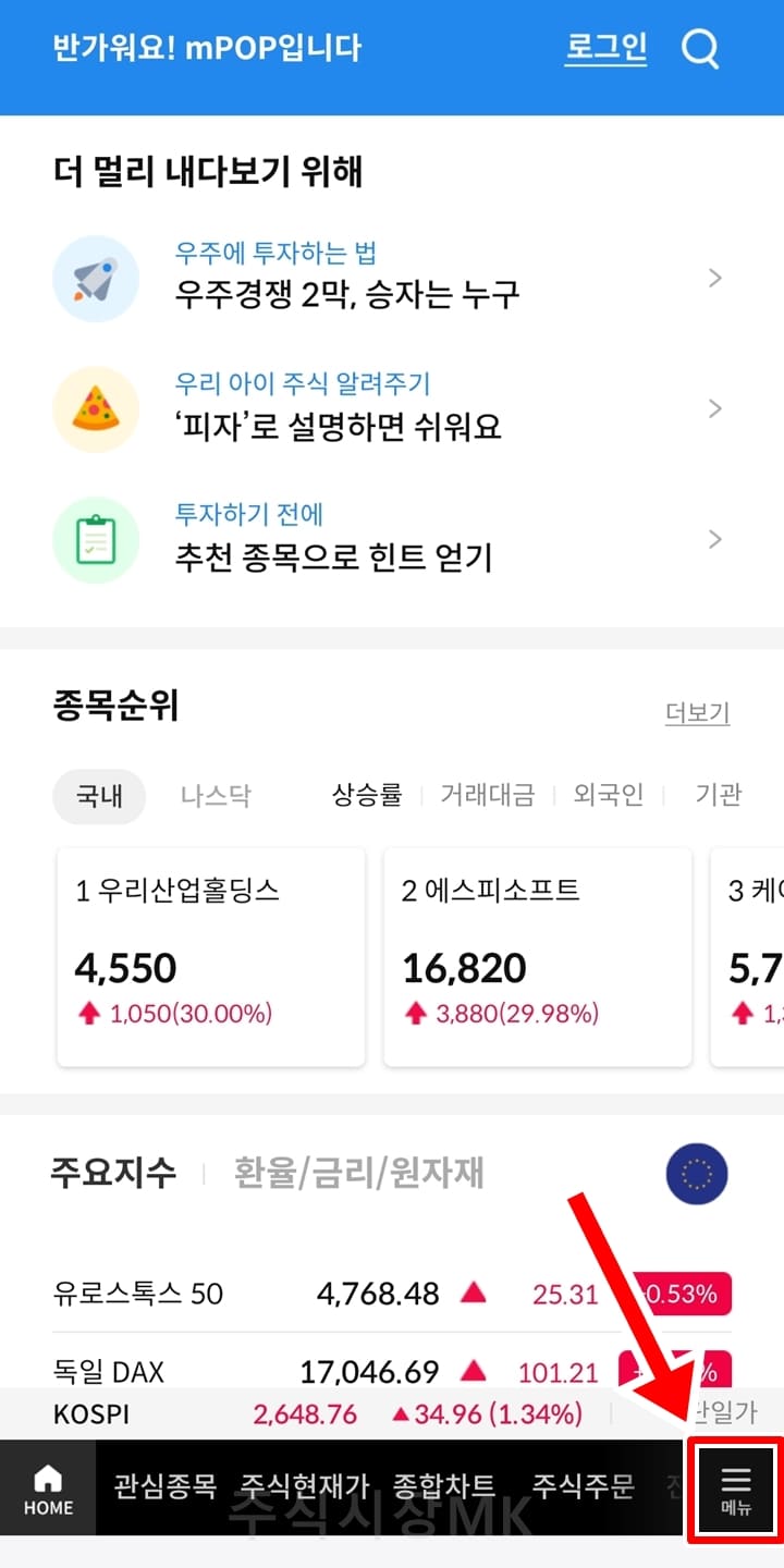 1. 삼성증권 mPOP 앱에서 메뉴를 클릭합니다.