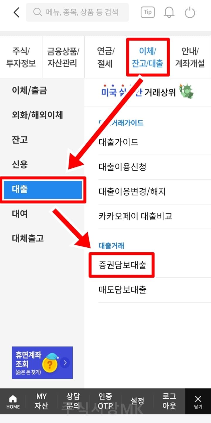 2. 이체/잔고 대출 > 대출 > 증권담보대출을 클릭합니다.