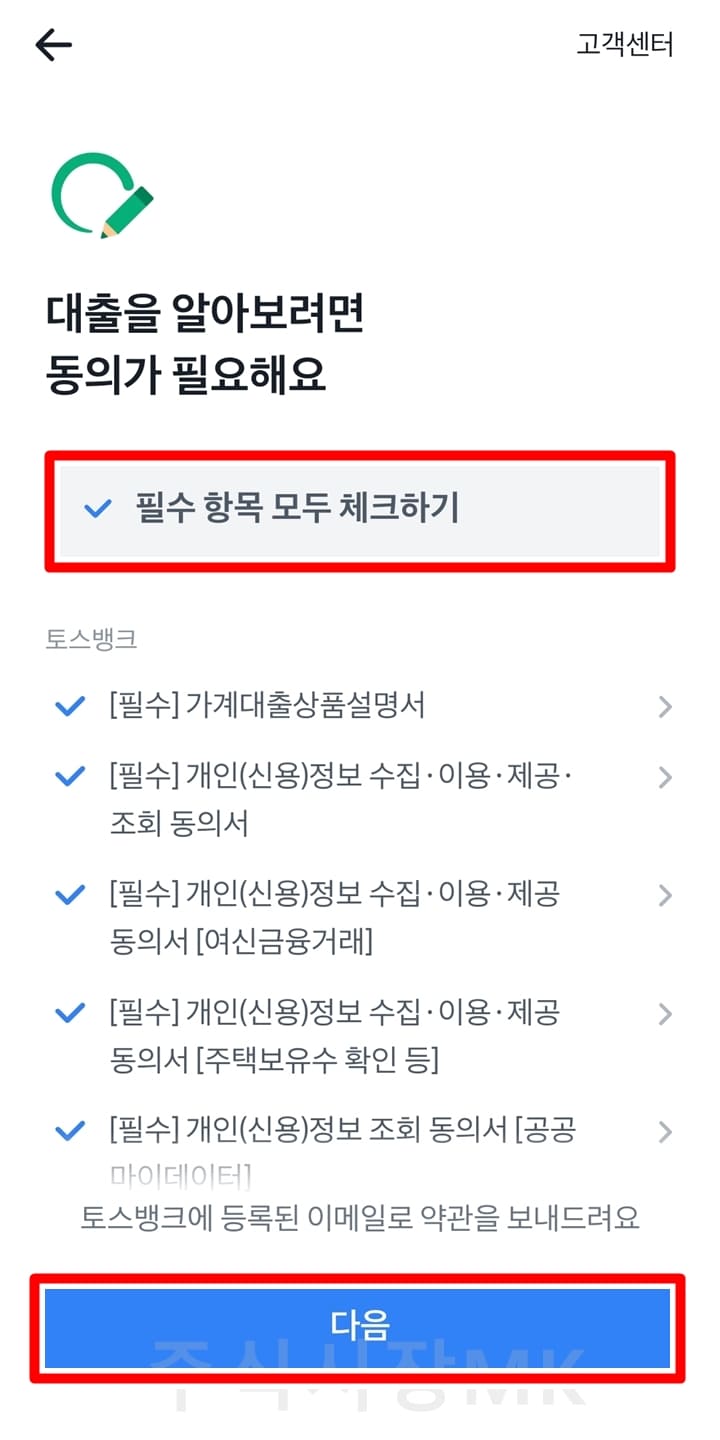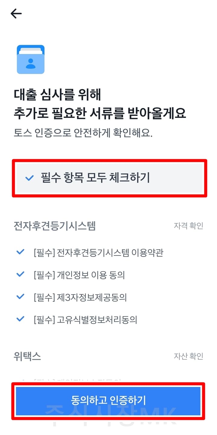 12. 대출 심사 서류에서 필수 항목 체크 및 동의하고 인증하기를 누릅니다.