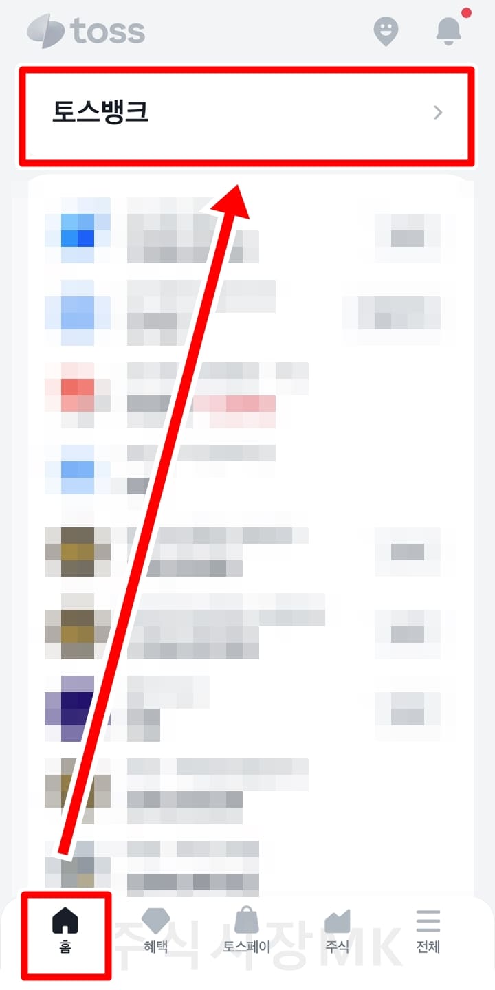 2. 홈화면에서 상단 토스뱅크를 클릭합니다.
