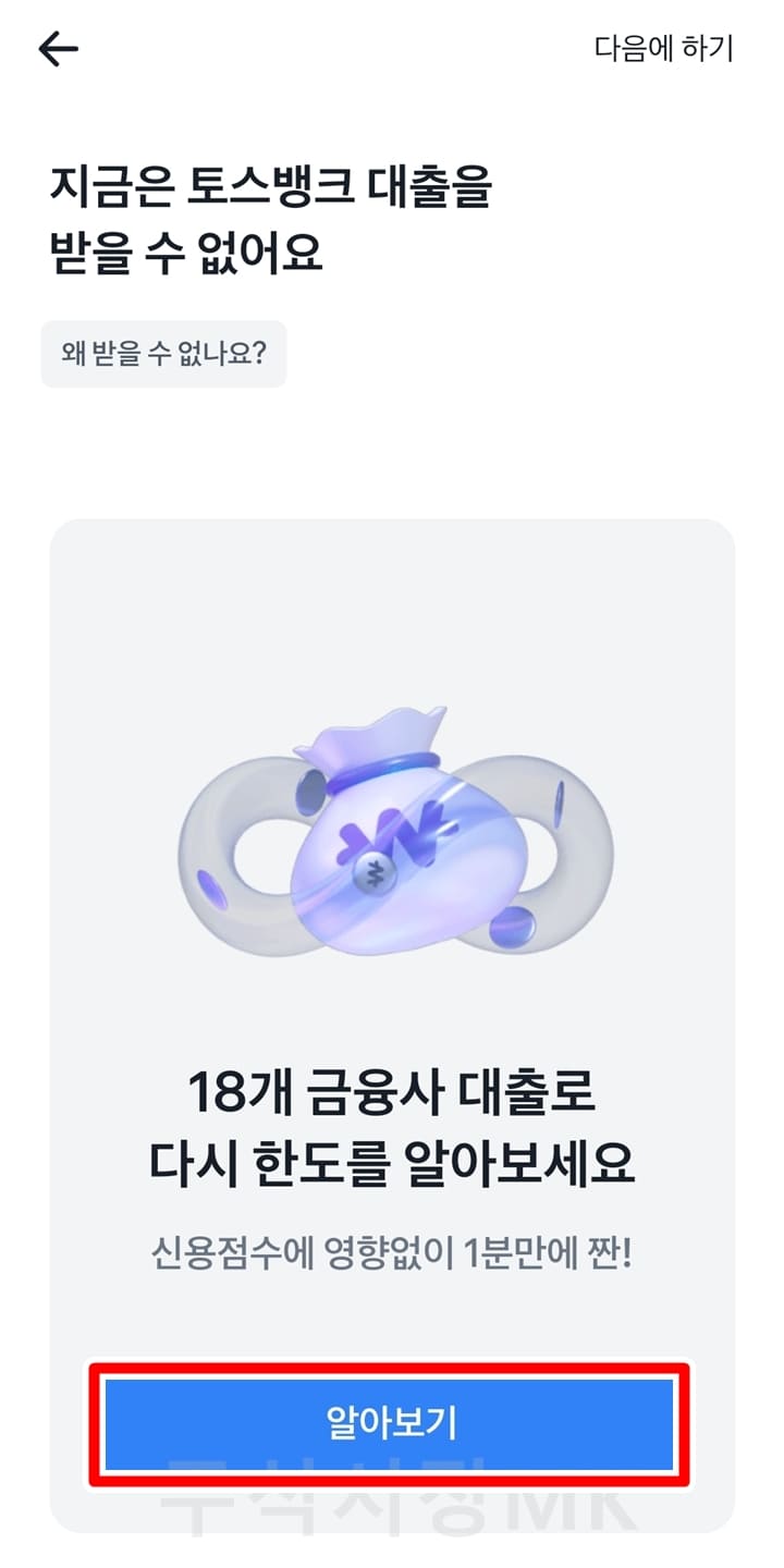 배너가 보이지 않는다면 신용대출을 클릭하여 진행하셔도 됩니다. 어차피 토스에서는 하나의 상품을 조회한 후에 다른 상품의 통합 조회 기능을 지원하고 있기 때문에 어떤 것이든 눌러 진행하셔도 좋습니다.
