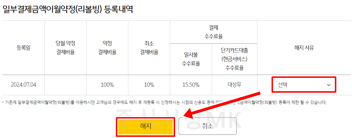 - 당월 결제일에 이용금액 전체를 결제하시려면 해지 하시기 전에 약정결제비율을 100%로 변경 후 해지하셔야 합니다. 참고로 약정 해지 후 다시 약정할 경우, 고객님의 신용 상태에 따라 재가입이 제한될 수 있습니다.