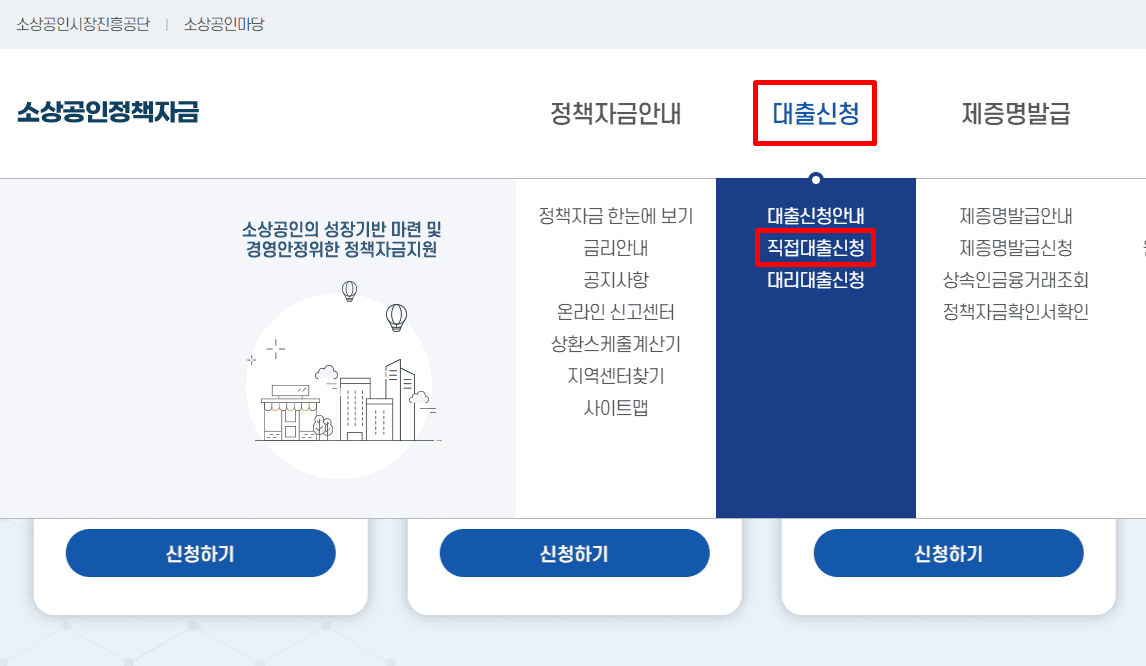 2. 상단 메뉴에서 대출 신청 > 직접대출 신청을 클릭합니다.