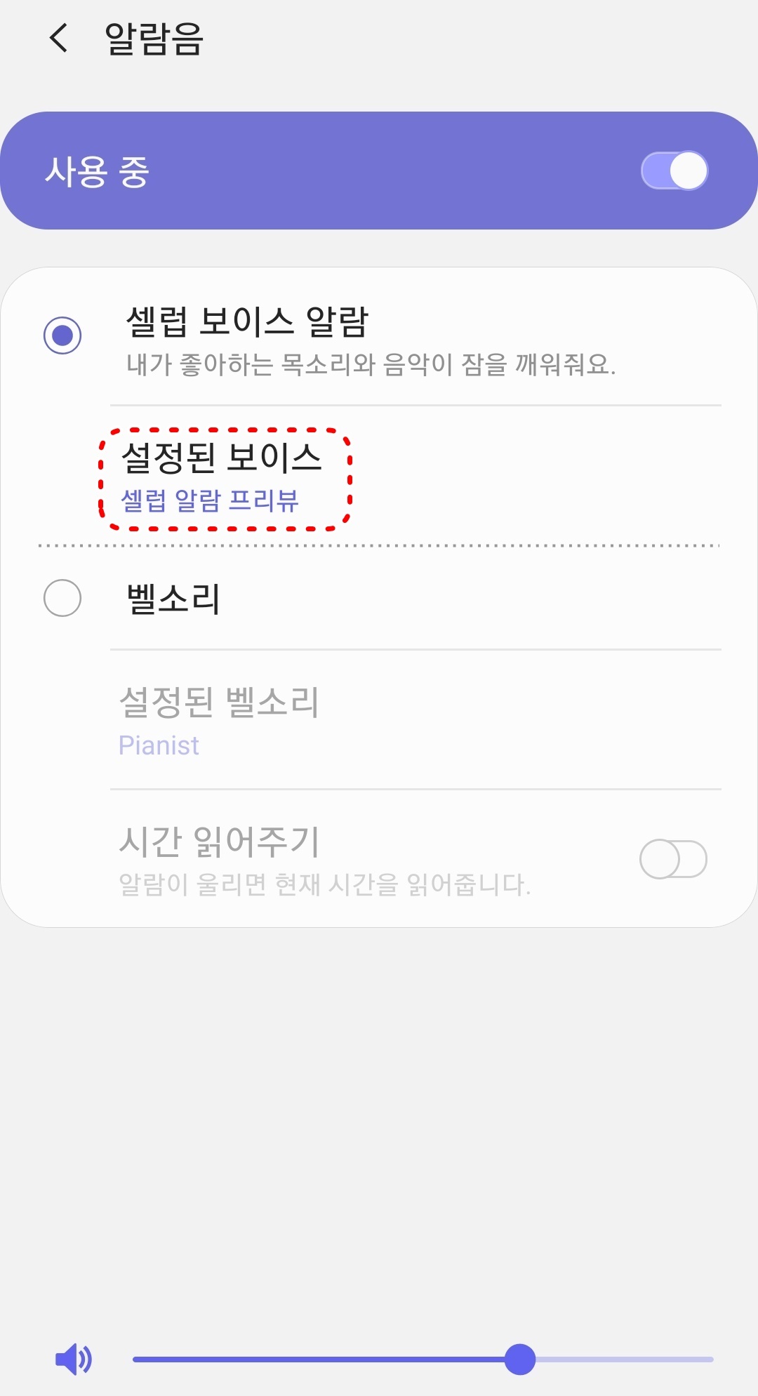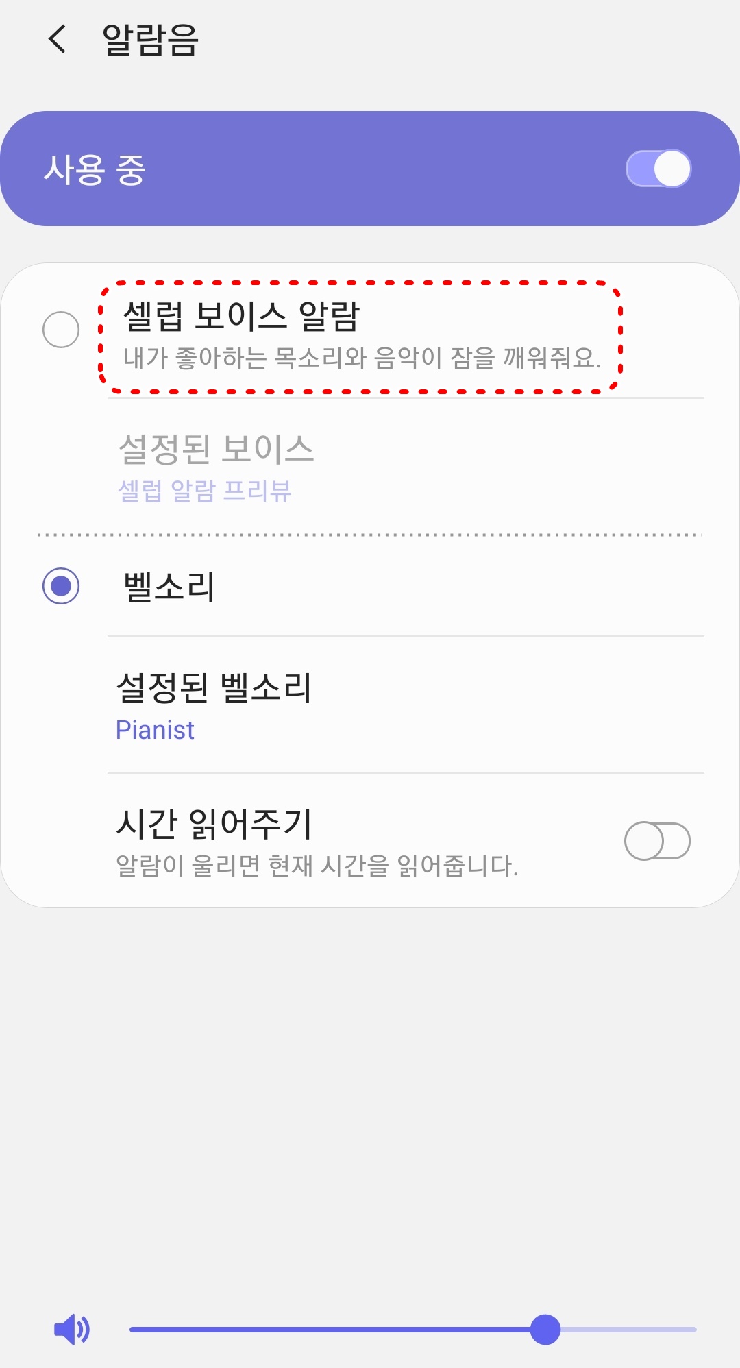 6. 벨소리에서 설정된 벨소리를 누르면 알람 소리를 변경할 수 있습니다.