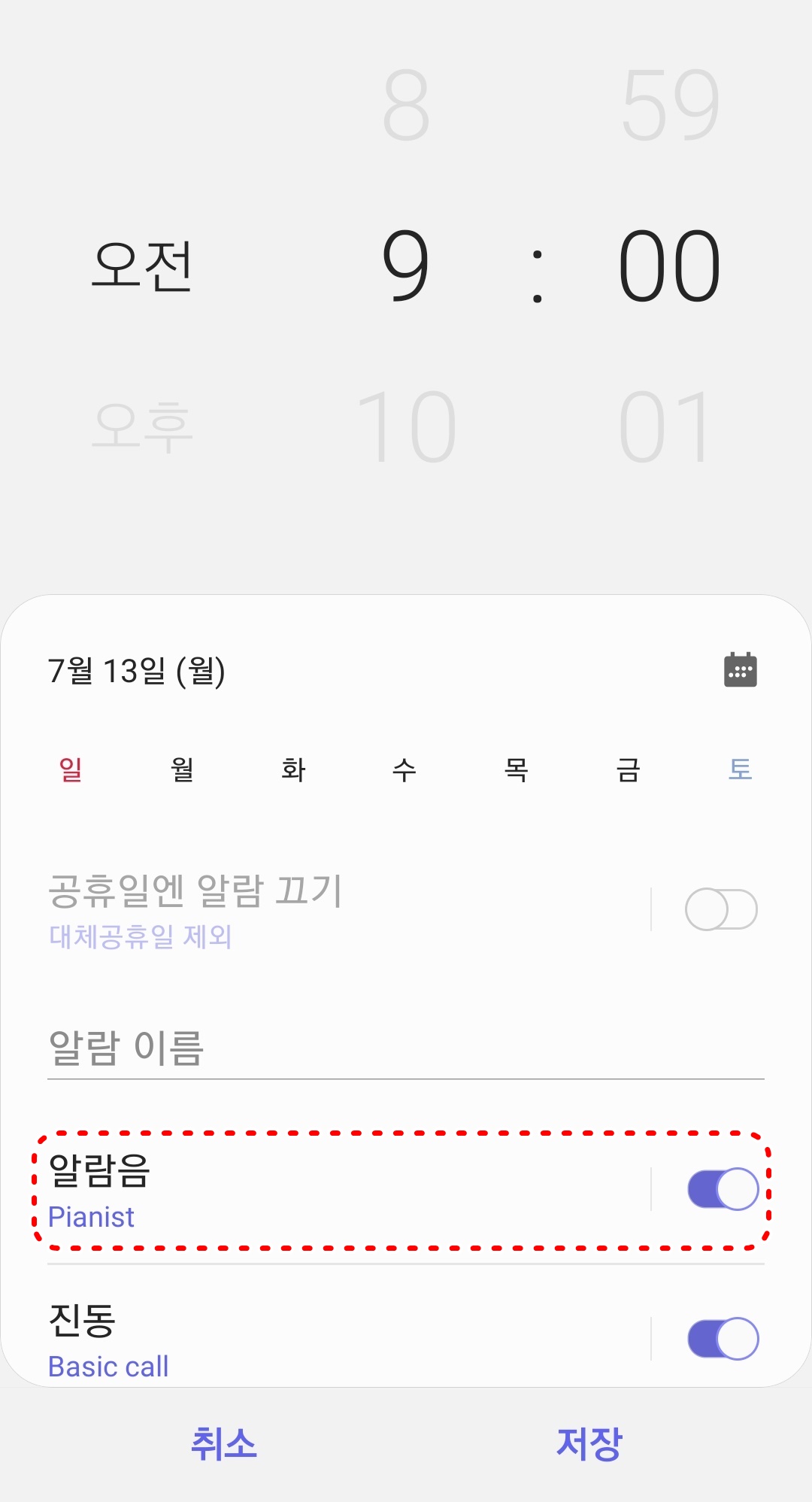 3. 시간을 설정하고 아래에 있는 알람음을 눌러줍니다.