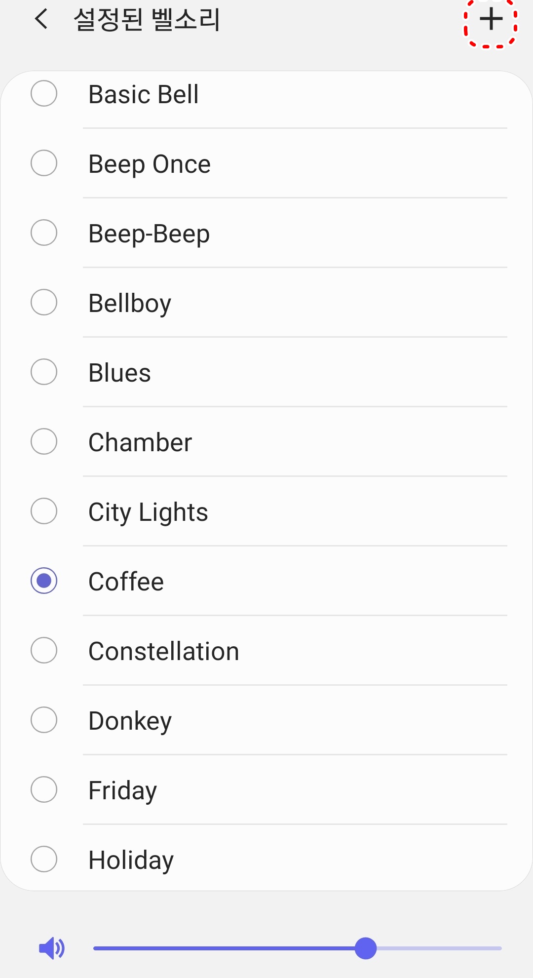 8. 우측 상단 +를 누르면 내가 가지고 있는 mp3 음악을 갤럭시 알람 소리 추가가 가능합니다.