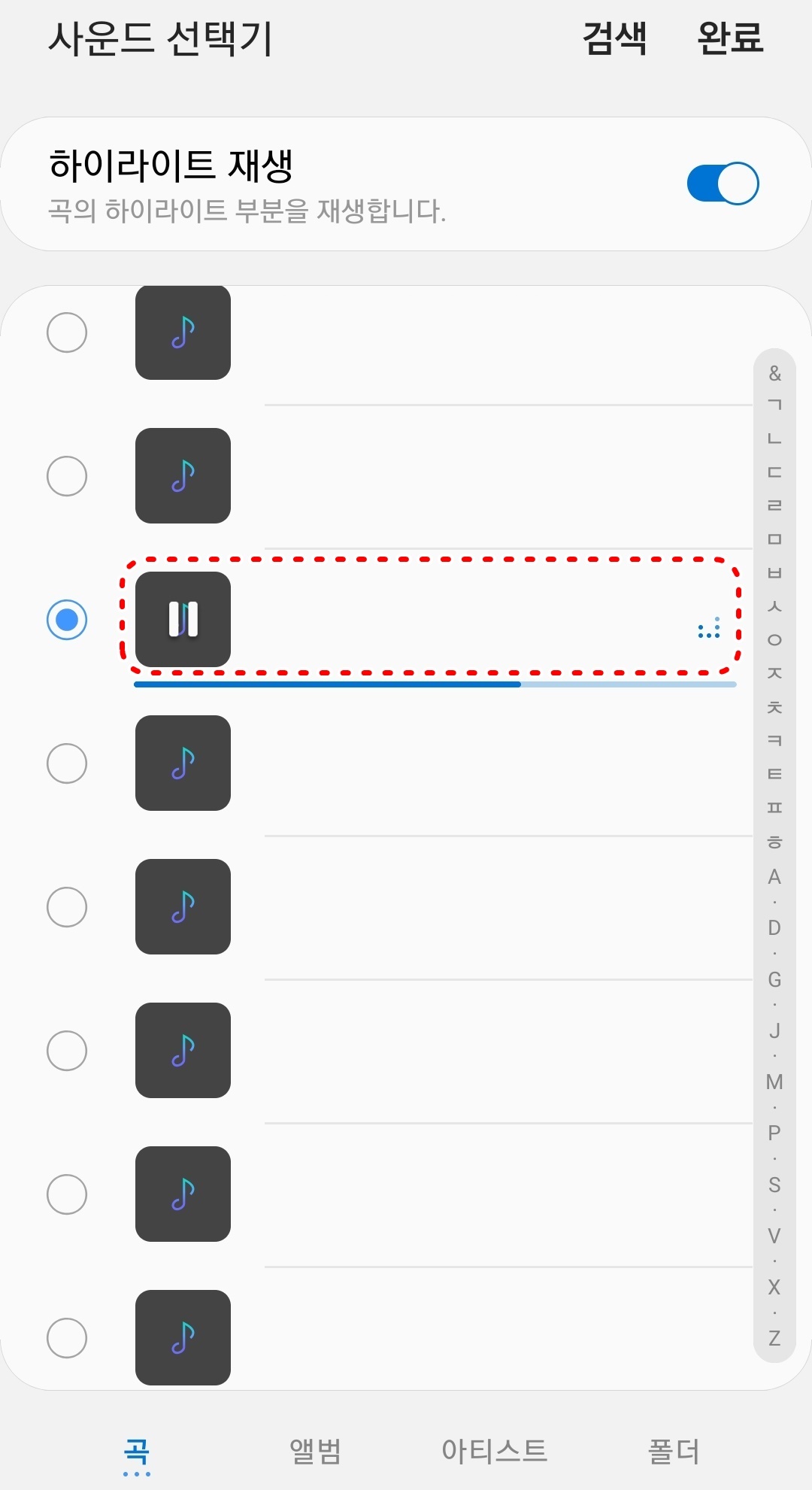 7. 갤럭시에 있는 음악들을 선택할 수 있습니다.
