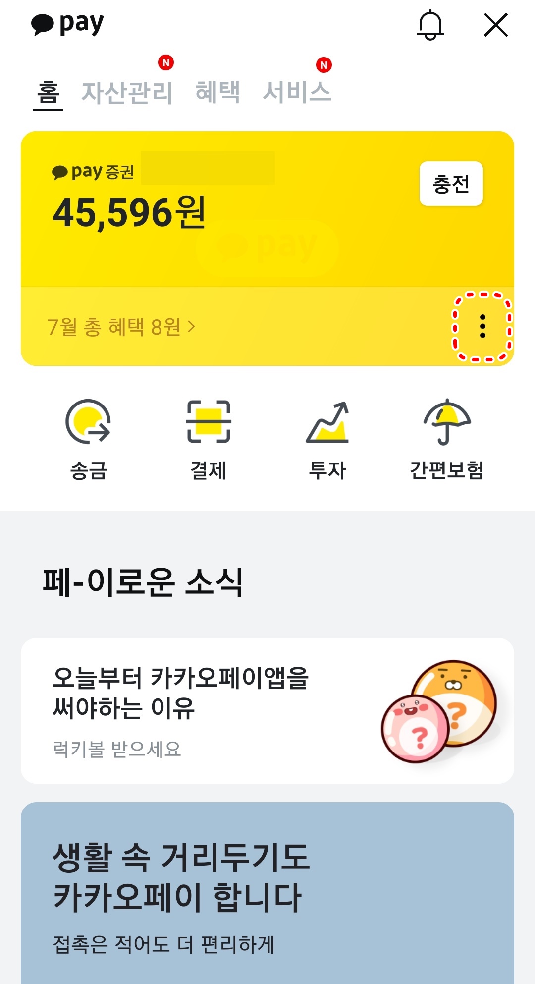 3. 카카오페이에서 노란색 박스 우측 하단에 있는 점 3개를 클릭합니다.
