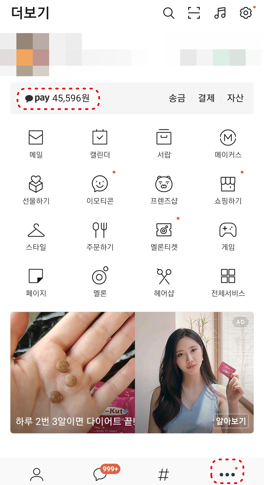 2. 더보기 창으로 들어와지면 상단 카카오페이 금액부분을 누릅니다.