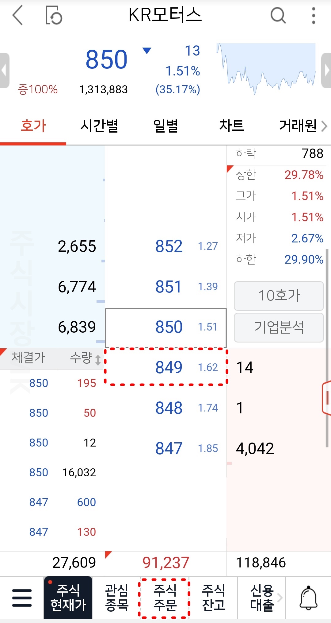 3. 주식주문 메뉴를 클릭하거나 원하는 호가 가격을 클릭해서 주문 페이지로 이동합니다.