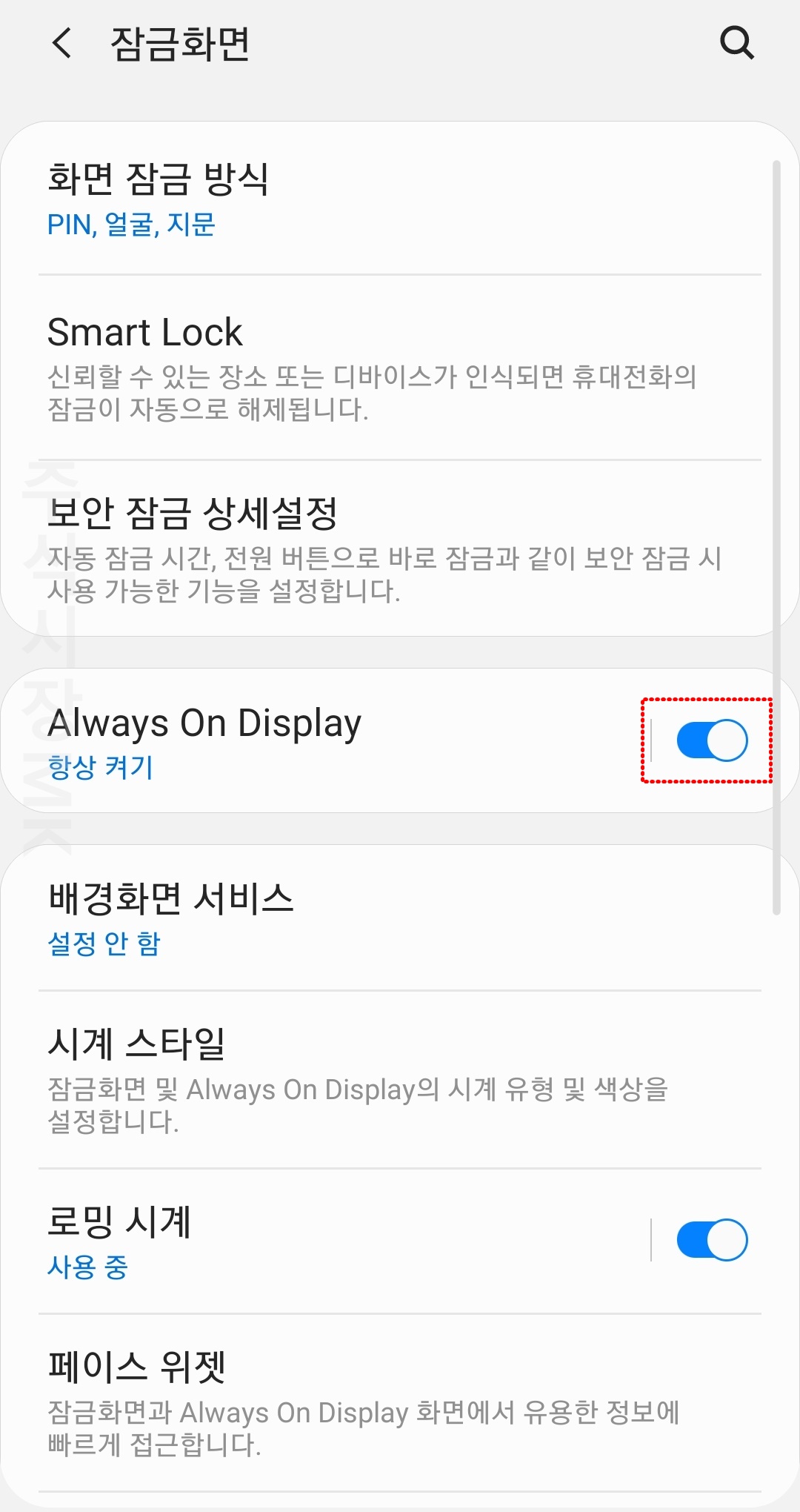▣ Always on Display는 화면이 켜지있지 않아도 시계나 중요 알림이 계속 표시되는 기능으로 배터리 소모가 크기도 하고, 준비 화면에서 보기 좋지 않은 위젯들이 보여지게 됩니다. 깔끔하게 잠금화면을 모두 없애기 위해서는 AOD 기능도 꺼주시는 것이 좋습니다.