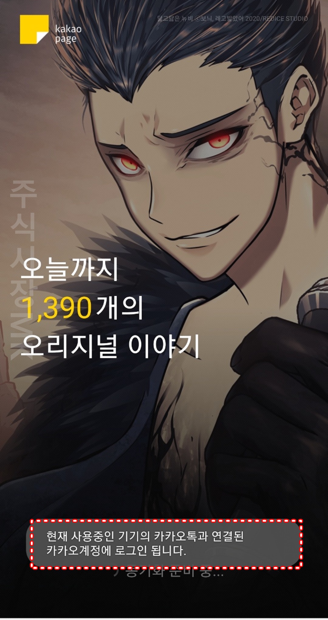 카카오페이지를 기기에 설치한 뒤 카카오계정으로 로그인을 클릭하면 "현재 사용중인 기기의 카카오톡과 연결된 카카오계정에 로그인 됩니다." 알림이 보여지고 자동 로그인되어지게 됩니다. 이 상황에서 현재 이용중인 카카오계정과 별개의 다른 계정으로 카카오페이지에 로그인하고 싶다면 아래 방법을 따라하시면 됩니다.